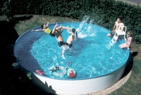 Freitragende Konstruktion nach DIN 31000 bzw. DIN 57100, zur Verwendung als Aufstell oder Einbaubecken. Stabile Stahlwand 0,60 mm, feuerverzinkt und außen weiß polyesterbeschichtet, innen schutzlackiert. Mit vorgestanzten Ausschnitten für Einbauskimmer und Einlaufdüsen. Formschöne Profilschienen aus stabilem Hart-PVC, als Handlauf ca. 40 mm, als Bodenschiene ca 25 mm breit. Qualitativ hochwertige Innenhülle 0,60 mm stark, UV stabilisiert mit Einhängebiese.